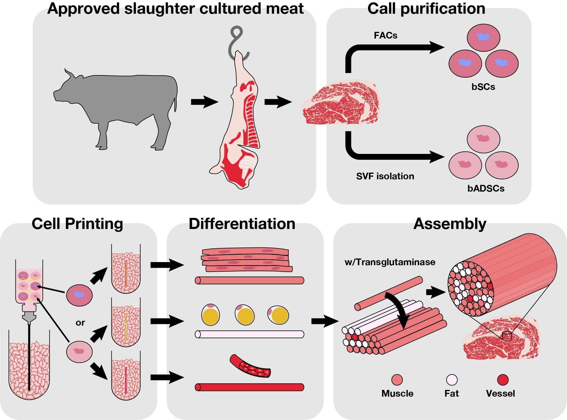 我々の培養肉の製造は、ウシの肉塊を採取することから始まります。筋肉、脂肪、血管の細胞を摘出後、培養して増やし、別々に3Dプリンターで直径1ミリ以下の線維状に形成します。それらをいくつも束ねて塊にすれば、サシ(脂肪)の入った牛肉(ステーキ肉)が完成します。筋肉や脂肪の割合は自在に調整できます。現状の手作業の成型では、1ミリ以下の塊ですが、小さいながらも肉の構造を持っているのが重要なポイントです。また、本手法はウシ以外の動物や魚の細胞にも適用が可能である汎用性の高い手法です。