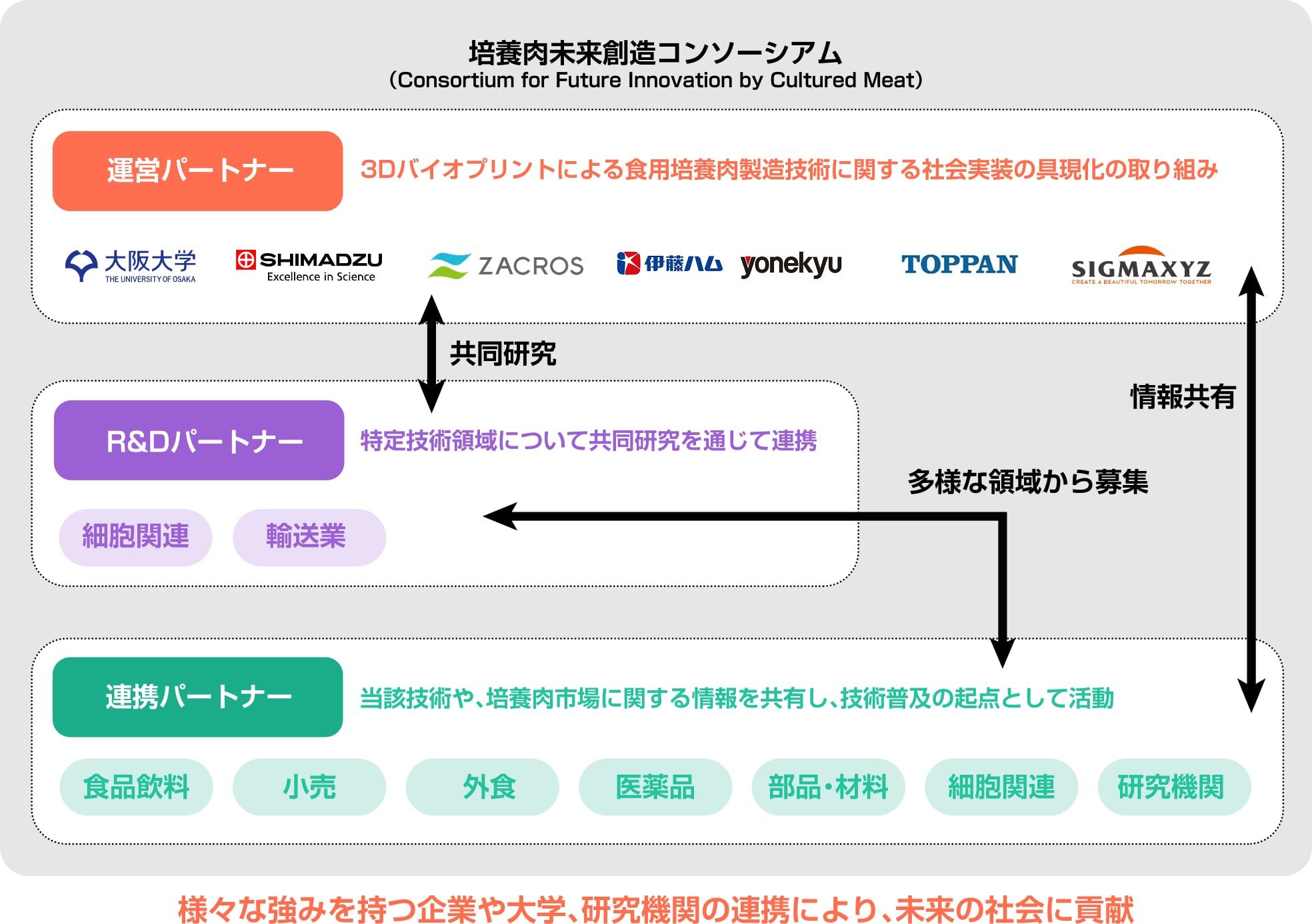2023年3月29日、大阪大学大学院工学研究科(以下、大阪大学)、株式会社島津製作所(以下、島津)、伊藤ハム米久ホールディングス株式会社(以下、伊藤ハム米久)、凸版印刷株式会社(現、TOPPANホールディングス株式会社 以下、TOPPAN)、株式会社シグマクシス(以下、シグマクシス)は、「培養肉未来創造コンソーシアム」を設立しました。その後、2024年5月8日より、ZACROS株式会社も参加し、6社を中核としてコンソーシアムを推進しています。