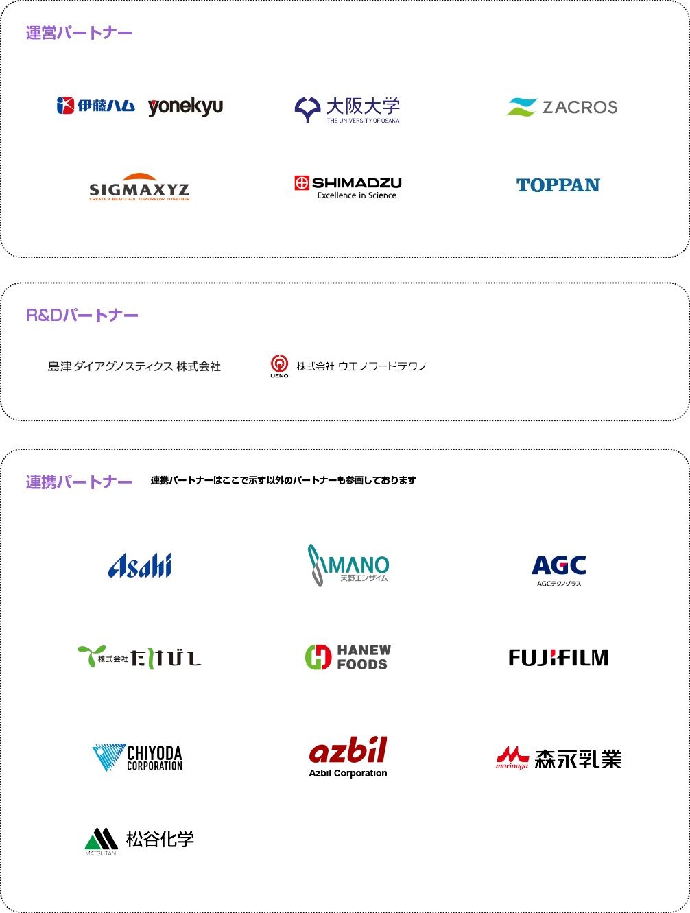 現在のコンソーシアム参画組織は、運営パートナーとしては、前述の6社(伊藤ハム米久ホールディングス、国立大学法人 大阪大学、ZACROS株式会社、株式会社シグマクシス・ホールディングス、株式会社 島津製作所、TOPPAN株式会社)が参画しており、その他にR&Dパートナー、連携パートナーとして12社参画しております。(運営パートナー含め18社、2025年6月時点)